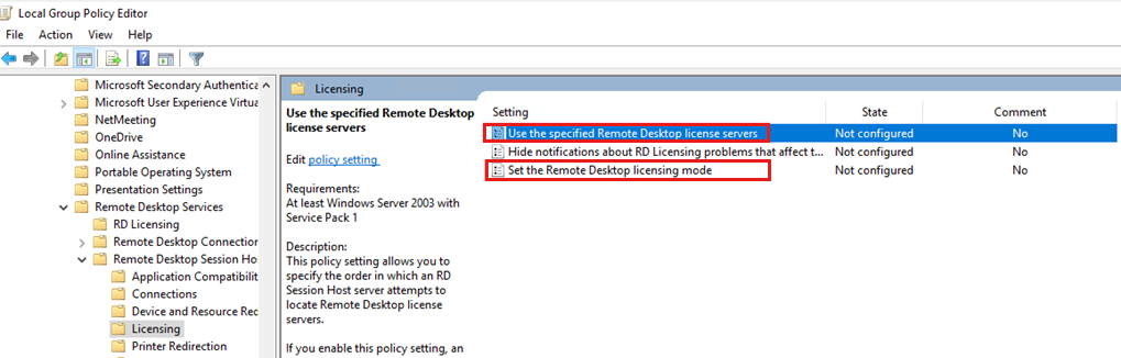 Vá para Configuração do Computador>Modelos Administrativos>Componentes do Windows>Serviços de Área de Trabalho Remota>Host da Sessão da Área de Trabalho Remota>Licenciamento.